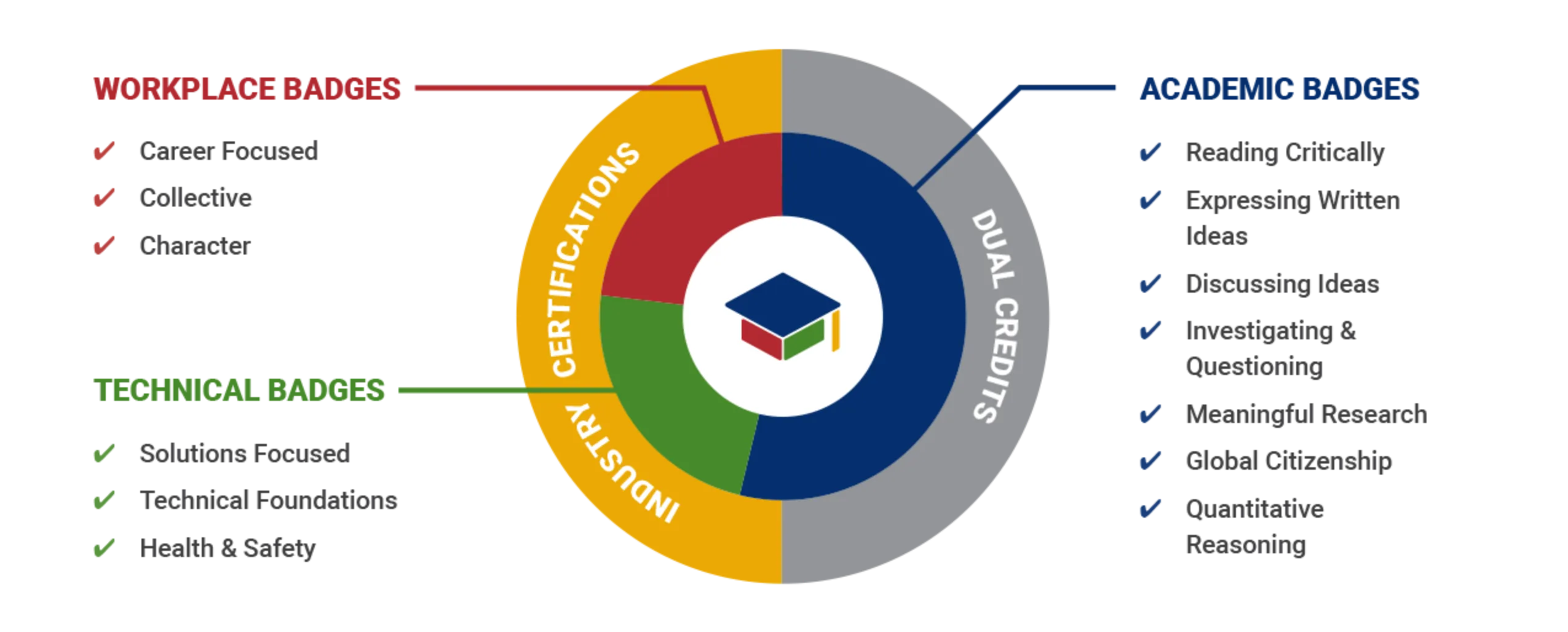 Badges. Students work towards badges that represent skills needed to succeed in their chosen careers.